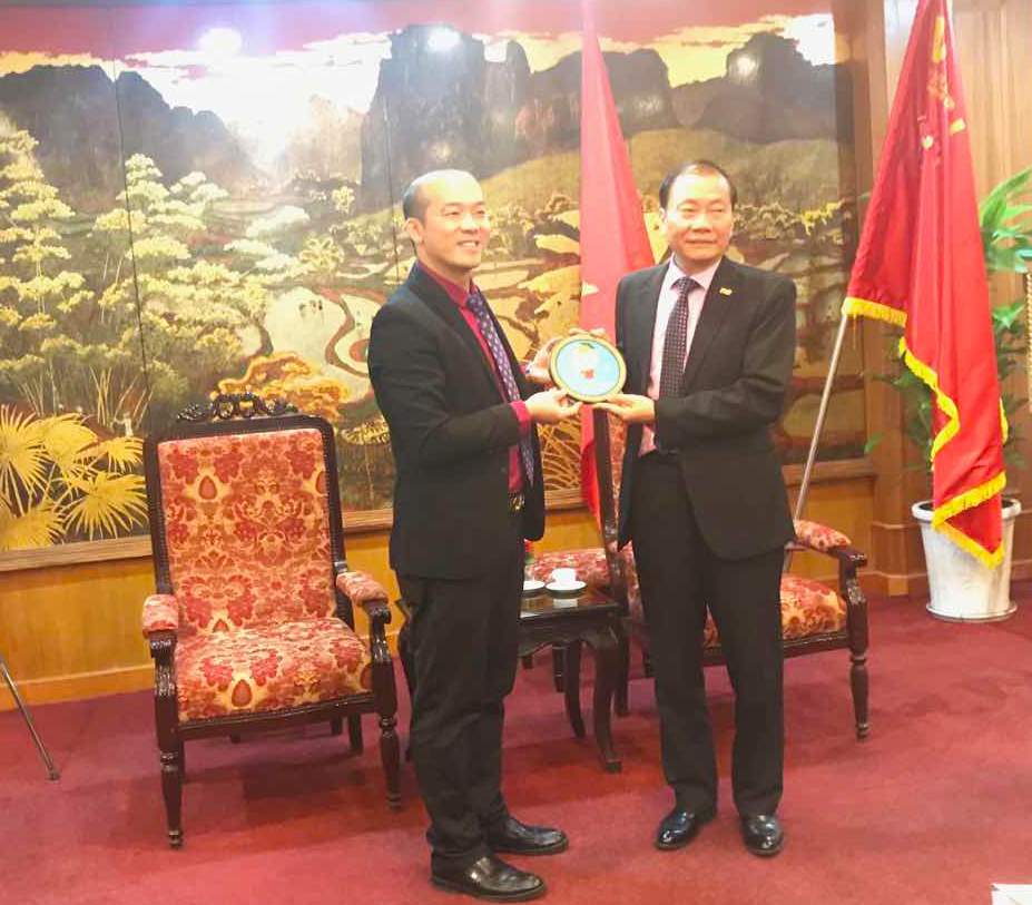 廣西金沛教育執(zhí)行董事粟宥朝(左一)拜訪越南工商總會副主席黃光防(右一)并贈送吉祥物“金小沛”