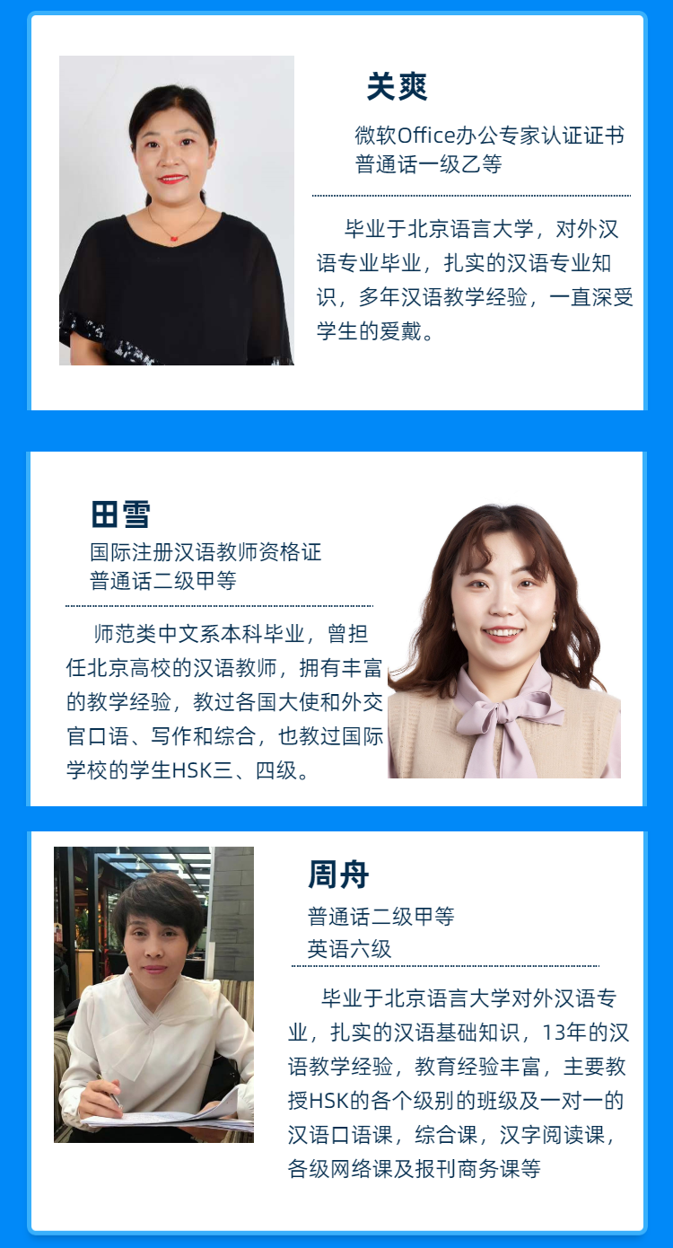 金沛漢語學(xué)院擁有雄厚師資力量和優(yōu)秀的教師團(tuán)隊,中國名校名師在線課堂,扎實的專業(yè)知識、漢語考試技巧、方向,根據(jù)學(xué)生目標(biāo),制定適合的教學(xué)計劃,助你順利過關(guān)!