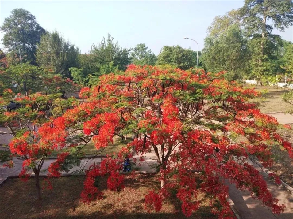 宿舍區(qū)有一片小森林,午后或者晚間,可以跟朋友一起散步,特別是炎熱的夏季,感受習(xí)習(xí)涼風(fēng),整個人神清氣爽,四月的宿舍樓下環(huán)境很迷人的,樹木長滿了紅花,就像火熱的天氣,好像在宣告著:夏天來了