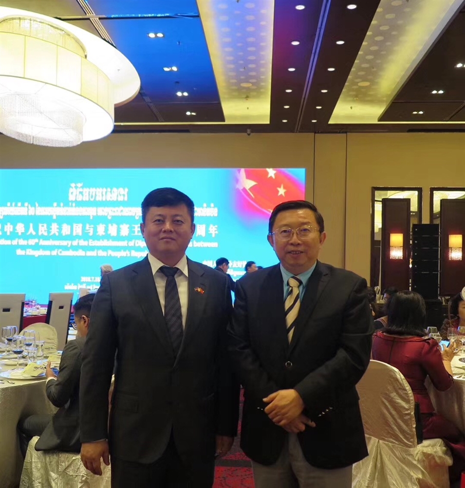 2018年北京,應(yīng)柬埔寨駐華大使邀請,中國—東盟商務(wù)理事會執(zhí)行理事長許寧寧出席慶祝中柬建交60周年招待會。招待會上,與柬埔寨駐華大使館公使銜商務(wù)參贊鐵弓交談。