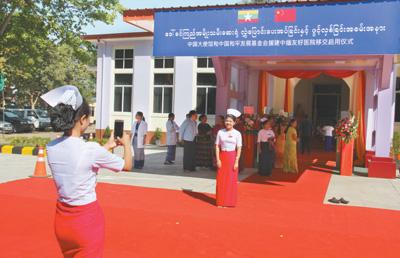 在中緬友好醫(yī)院暨杜慶芝醫(yī)院移交啟用儀式上,醫(yī)院護士在醫(yī)院門口拍照留念。
