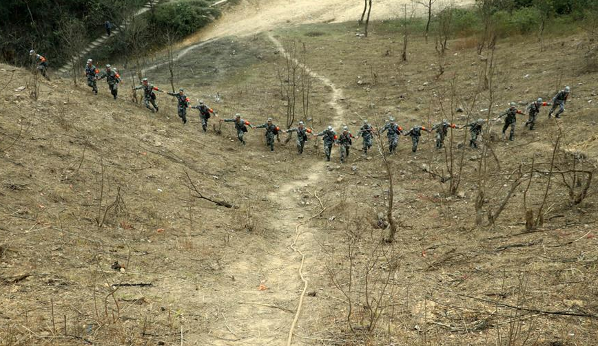 掃雷官兵手拉手走過完成清理的中越邊境廣西段某雷場(12月22日攝)。為了讓百姓放心,向地方政府交付雷場時,掃雷官兵將手拉手在作業(yè)完的雷場上來回走幾遍。 11月27日,中越邊境廣西段新一輪掃雷行動全面啟動。此次行動的主要任務(wù)是徹底掃除和封圍廣西邊境附近53處共計約205萬平方米的雷場。12月22日,記者隨南部戰(zhàn)區(qū)陸軍廣西西線掃雷隊,前往中越邊境某雷場,用照片紀(jì)錄排雷官兵清理雷區(qū)的驚險過程。