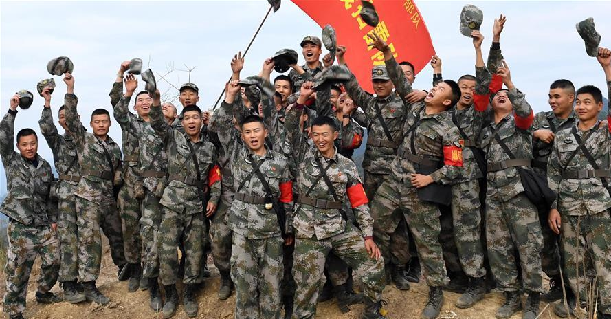 掃雷官兵在完成中越邊境廣西段某雷場清理工作后慶祝